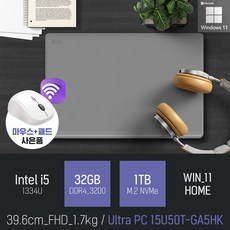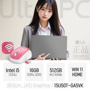 LG 울트라PC 15U50T-GA5HK는 15.6인치 화면과 효율적인 성능을 갖춘 노트북으로, 사무용과 학습용 모두에 적합하며 무선 마우스와 패드가 포함되어 편리하게 사용할 수 있습니다.