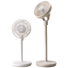 BLDC 모터로 저소음 운전이 가능하며, 접이식과 폴딩 디자인으로 휴대와 보관이 편리하고, 리모컨으로 풍속과 회전 조절이 가능하며 보관가방이 포함된 무선 선풍기 겸 써큘레이터.