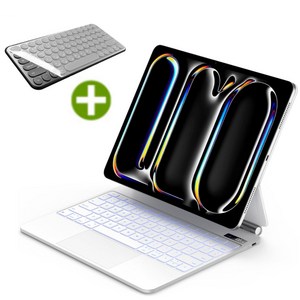 iPad Pro M4·M5 11인치와 13인치, 7·8세대 프로11/프로13에 호환되는 매직 키보스 블루투스 케이스로, 한글 각인된 키보드를 갖추고 있어 타이핑에 편리하다.
