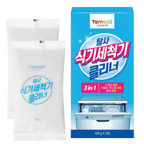 탐사 식기세척기 전용 클리너로, 100g 용량 2개 구성이며, 식기세척기 내부의 물때와 오염물을 깨끗하게 제거해 위생적이고 쾌적한 세척 환경을 유지할 수 있는 제품입니다.