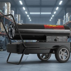 대형 산업용 열풍기로, 전기와 등유를 연료로 사용하여 건설현장, 비닐하우스, 축사 등 넓은 공간을 빠르고 효율적으로 난방 및 건조할 수 있으며 60평형까지 온기 공급이 가능함.