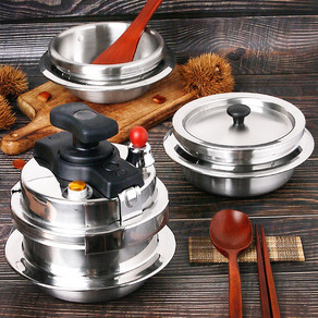 IH 인덕션에서 사용할 수 있는 스테인리스 미니 압력솥으로 1인이나 2인 소량 밥짓기에 적합하다. 캠핑과 가정에서 모두 활용 가능하며 받침이 함께 구성돼 조리 후 안전하게 올려두기 좋다.