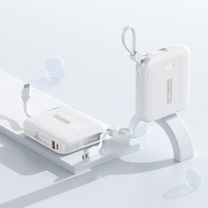10000mAh 용량으로 스마트폰과 태블릿 등 기기를 여러 번 충전할 수 있고 마카롱 디자인과 올인원 케이블 기능으로 편리하게 사용할 수 있는 화이트 보조배터리입니다.