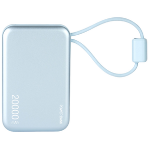 20000mAh 용량으로 여러 기기를 여러 번 충전할 수 있고 케이블이 일체형으로 편리하며 예쁘고 가벼운 블루 색상의 휴대용 보조배터리입니다.