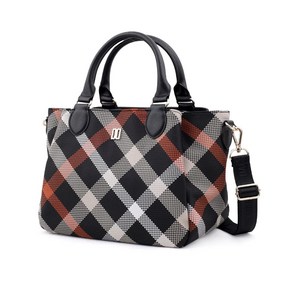 체크 패턴과 경량 소재가 조화된 여성용 토트백으로, 세련된 디자인과 실용적인 수납 공간을 갖추어 데일리와 격식 있는 자리 모두 활용 가능함.